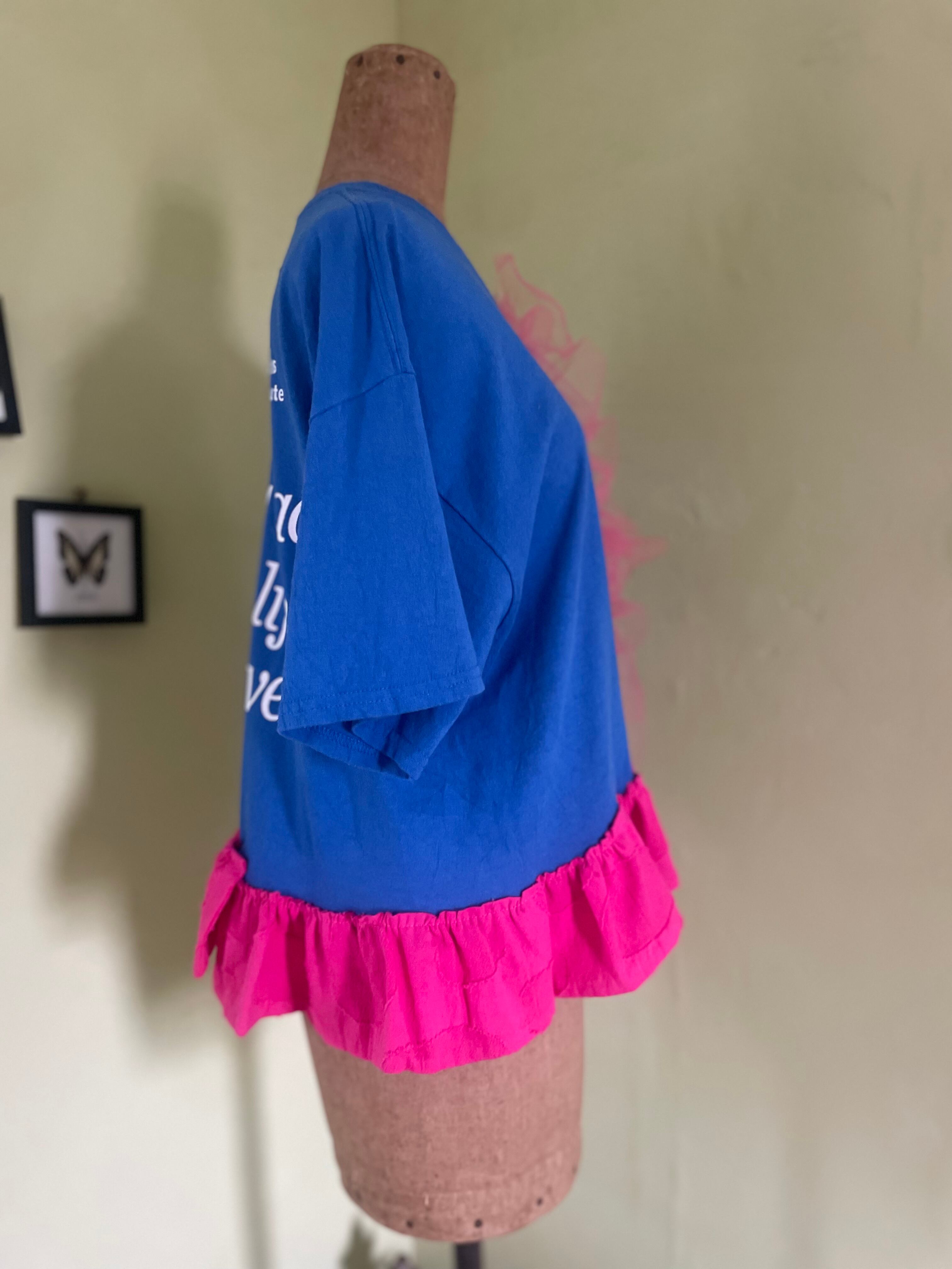 Tシャツ 古着 リメイク 1点もの カラフル 半袖 ピンク フリル 青 緑 pink green blue